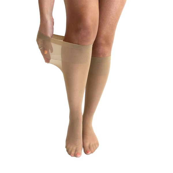 En effet, elles sont tricotées avec le même maillage spécial 3D qui rend le tissu incroyablement élastique : il s'étire suffisamment pour s'adapter à toutes les morphologies, jusqu'à 85 cm de tour de mollet et, une fois porté, maintient sa forme sans se détendre ni faire de pli. De plus, le mi-bas n'a pas de talon pour convenir à toutes les pointures. Que vous chaussiez du 36 ou du 45, il vous conviendra parfaitement, sans zone de tension!